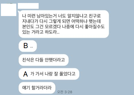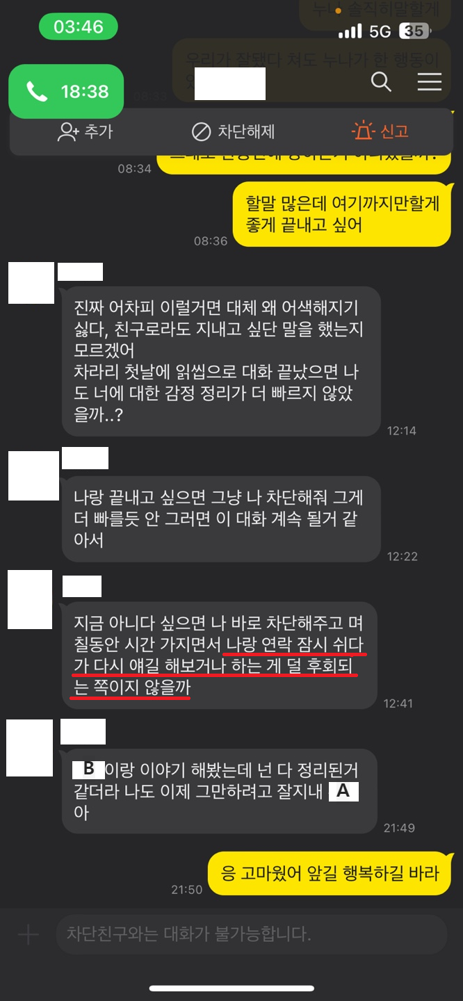 이후 A가 친구로 남는것도 힘들겠다며 카톡, 인스타, 전화 등을 다 차단했다고 하였음.
